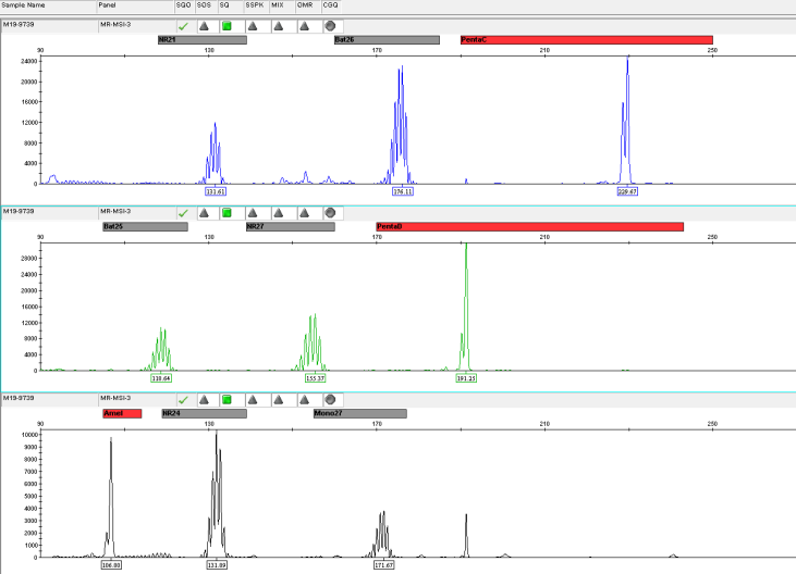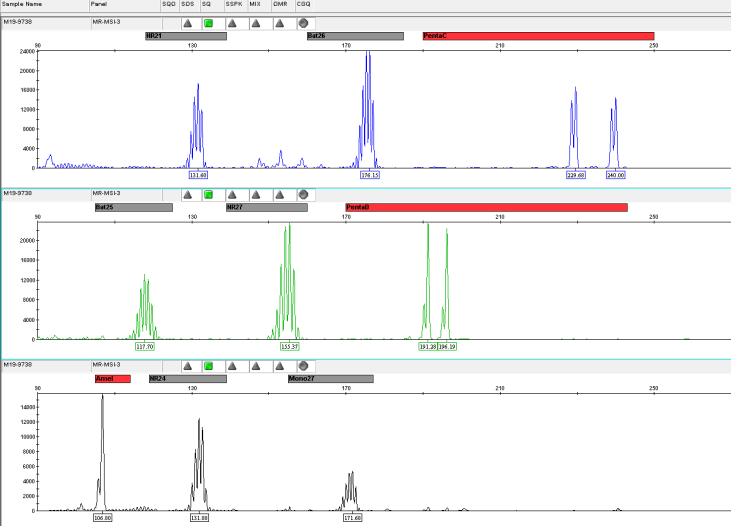 微衛(wèi)星是人類基因組的一段串聯(lián)重復(fù)序列,一般在1~6bp之間,又被稱作短串連重復(fù)(Short Tandem Repeats,STRs)或簡單重復(fù)序列(Simple Sequence Repeat,SSRs)。 微衛(wèi)星不穩(wěn)定(Microsatellite Instability,MSI)指的是微衛(wèi)星重復(fù)次數(shù)減少或者增加,微衛(wèi)星不穩(wěn)定的內(nèi)在機制是錯配修復(fù)(MMR)系統(tǒng)失調(diào),從而限制了糾正微衛(wèi)星自發(fā)的長度改變的體細胞突變的能力,體細胞突變積累,最終形成MSI。