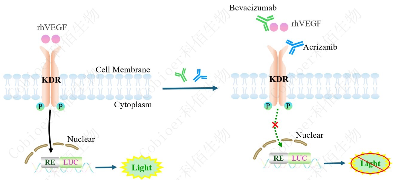 VEGF(KDR) Effector Reporter Cell 報(bào)告基因藥靶模型很好的模擬了體內(nèi) VEGF(KDR)的信號轉(zhuǎn)導(dǎo)過程,原理見下圖所示。