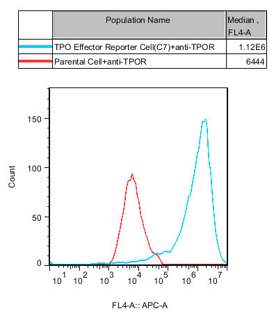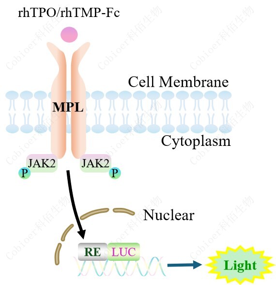 TPO Effector Reporter Cell 報告基因藥靶模型很好的模擬了體內 TPO 的信號轉導過程, 原理見下圖所示。![]() Figure 1. TPO Effector Reporter Cell 細胞模型原理圖 |