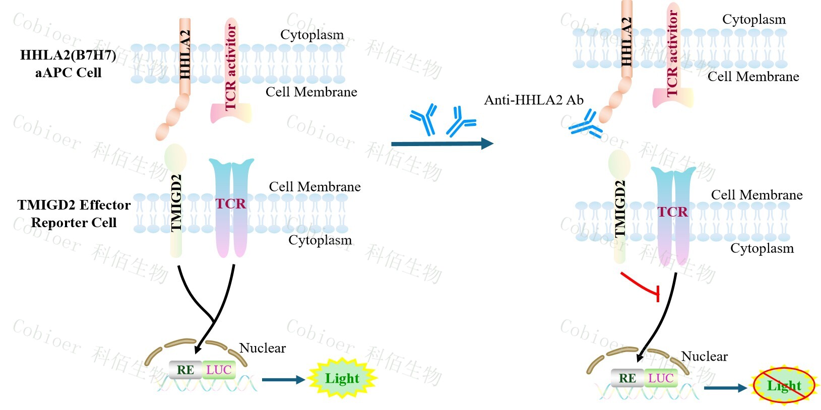 TMIGD2 Effector Reporter Cell 報(bào)告基因藥靶模型很好的模擬了體內(nèi) TMIGD2 的信號(hào)轉(zhuǎn) 導(dǎo)過(guò)程,原理見下圖所示。![]() Figure 1. TMIGD2 Effector Reporter Cell 模型原理圖 |