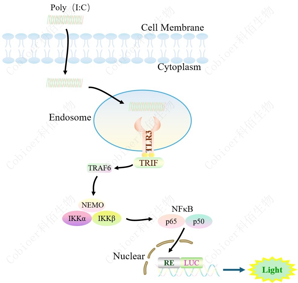 TLR3 NFκB-Luc HEK293 報(bào)告基因藥靶模型很好的模擬了體內(nèi) TLR3 的信號(hào)轉(zhuǎn)導(dǎo)過程, 原理見下圖所示。