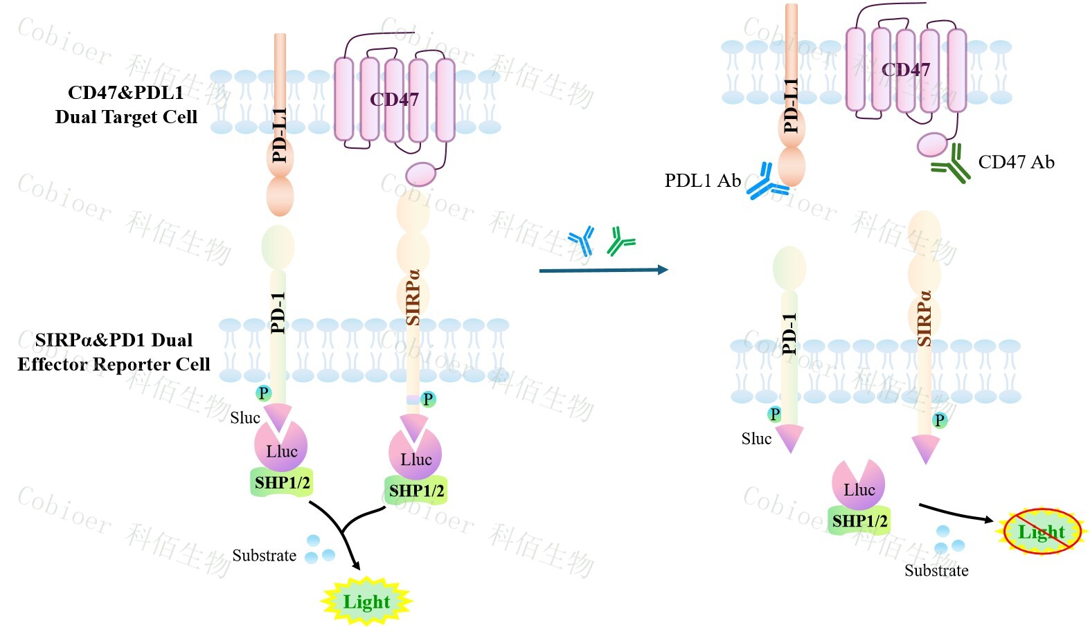 SIRPα&PD1 Dual Effector Reporter Cell 報 告 基 因 藥 靶 模 型 很 好 的 模 擬 了 體 內 SIRPα&PD1 的信號轉導過程,原理見下圖所示。