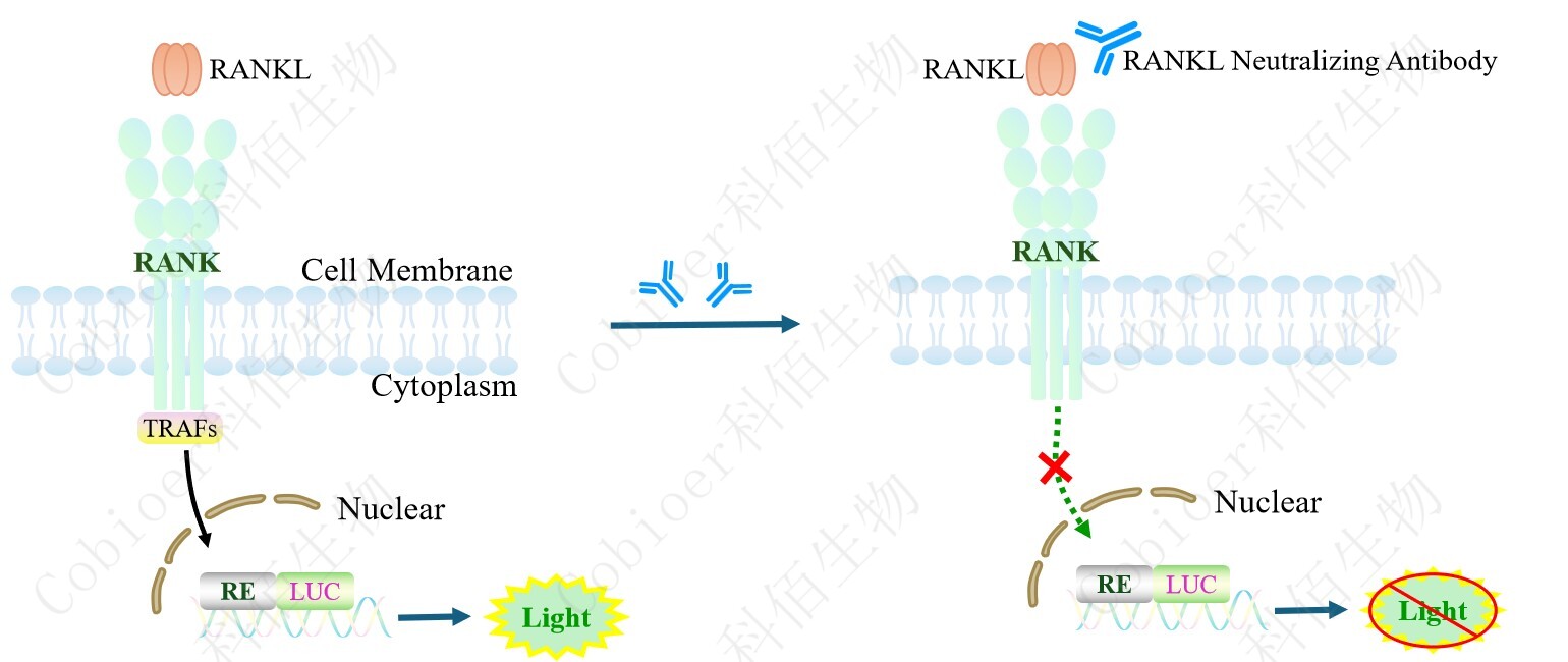 RANK Effector Reporter Cell 報告基因藥靶模型很好的模擬了體內(nèi) RANK 的信號轉(zhuǎn)導(dǎo)過程,原理見下圖所示。![]() Figure 1. RANK Effector Reporter Cell 細(xì)胞模型原理圖 |