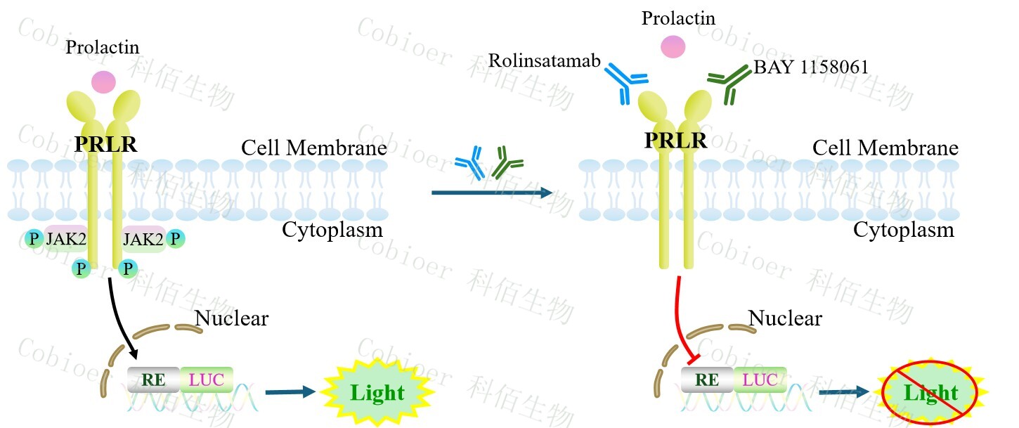 PRL Effector Reporter Cell 報(bào)告基因藥靶模型很好的模擬了體內(nèi) PRL 的信號轉(zhuǎn)導(dǎo)過程, 原理見下圖所示。![]() Figure 1. PRL Effector Reporter Cell 模型原理圖 |