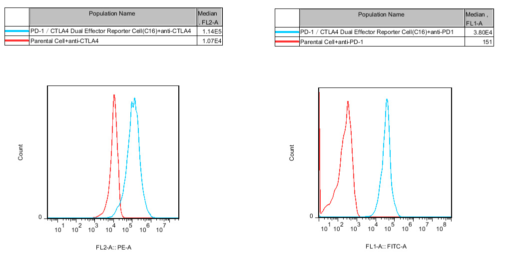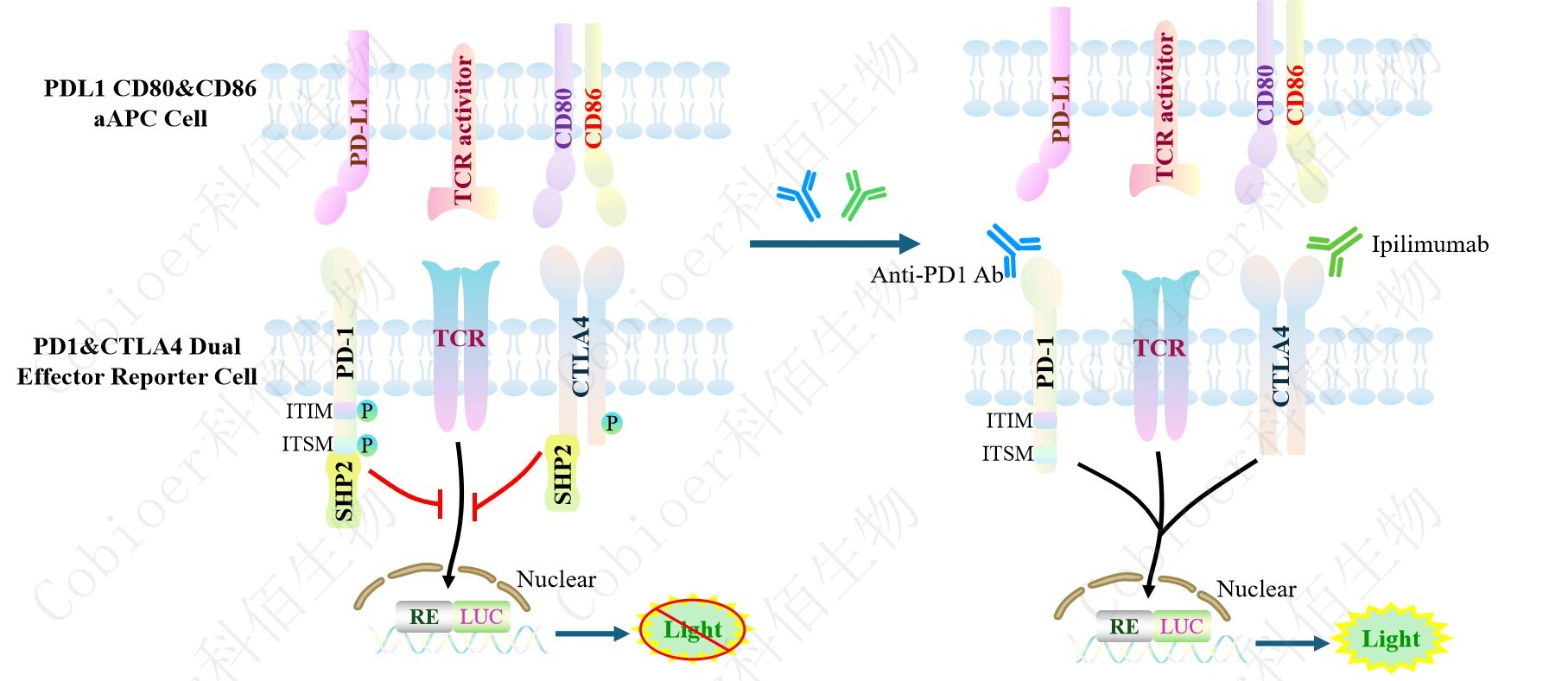 PD1&CTLA4 Dual Effector Reporter Cell 報(bào) 告 基 因 藥 靶 模 型 很 好 的 模 擬 了 體 內(nèi) PD1&CTLA4 的信號(hào)轉(zhuǎn)導(dǎo)過程,原理見下圖所示。