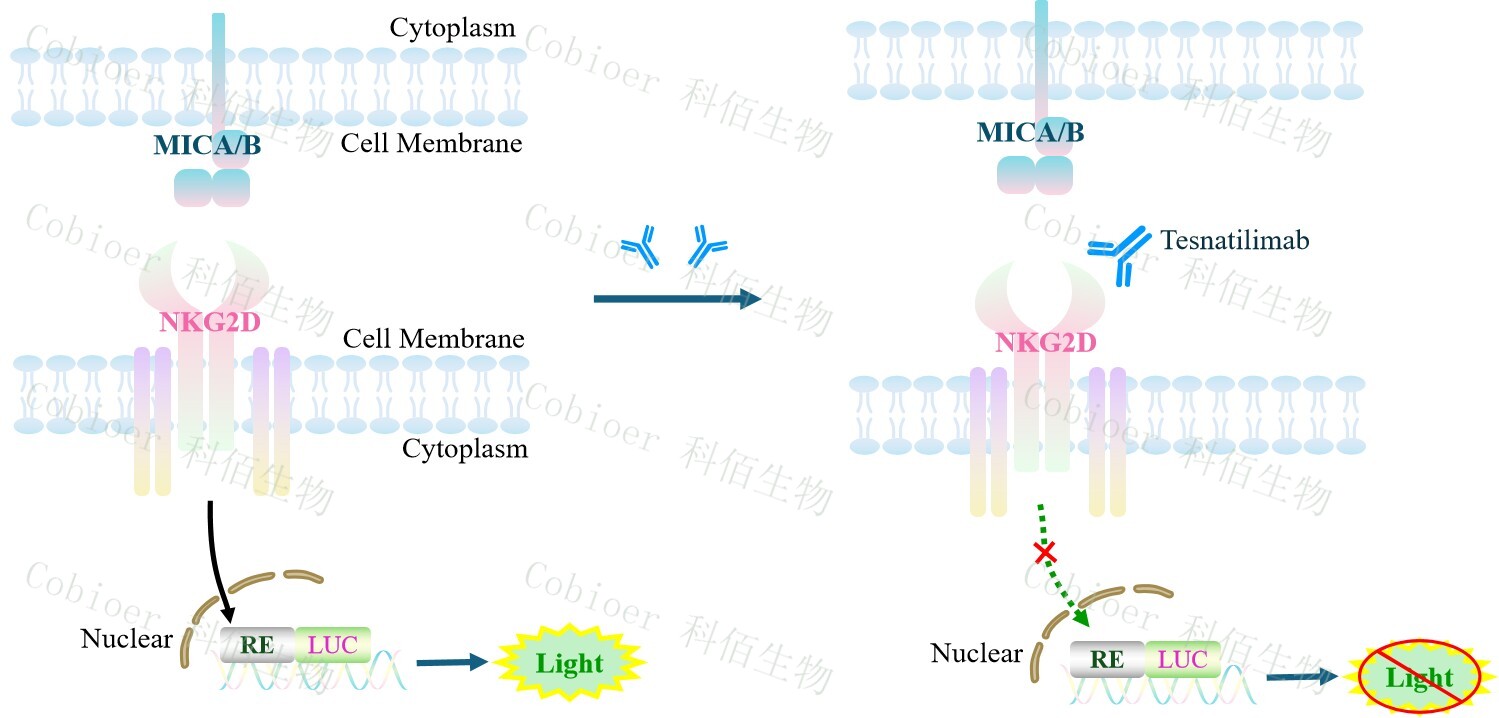 NKG2D Effector Reporter Cell 報告基因藥靶模型很好的模擬了體內(nèi) NKG2D 的信號轉(zhuǎn)導(dǎo)過程,原理見下圖所示。![]() Figure 1. NKG2D Effector Reporter Cell 細(xì)胞模型原理圖 |
