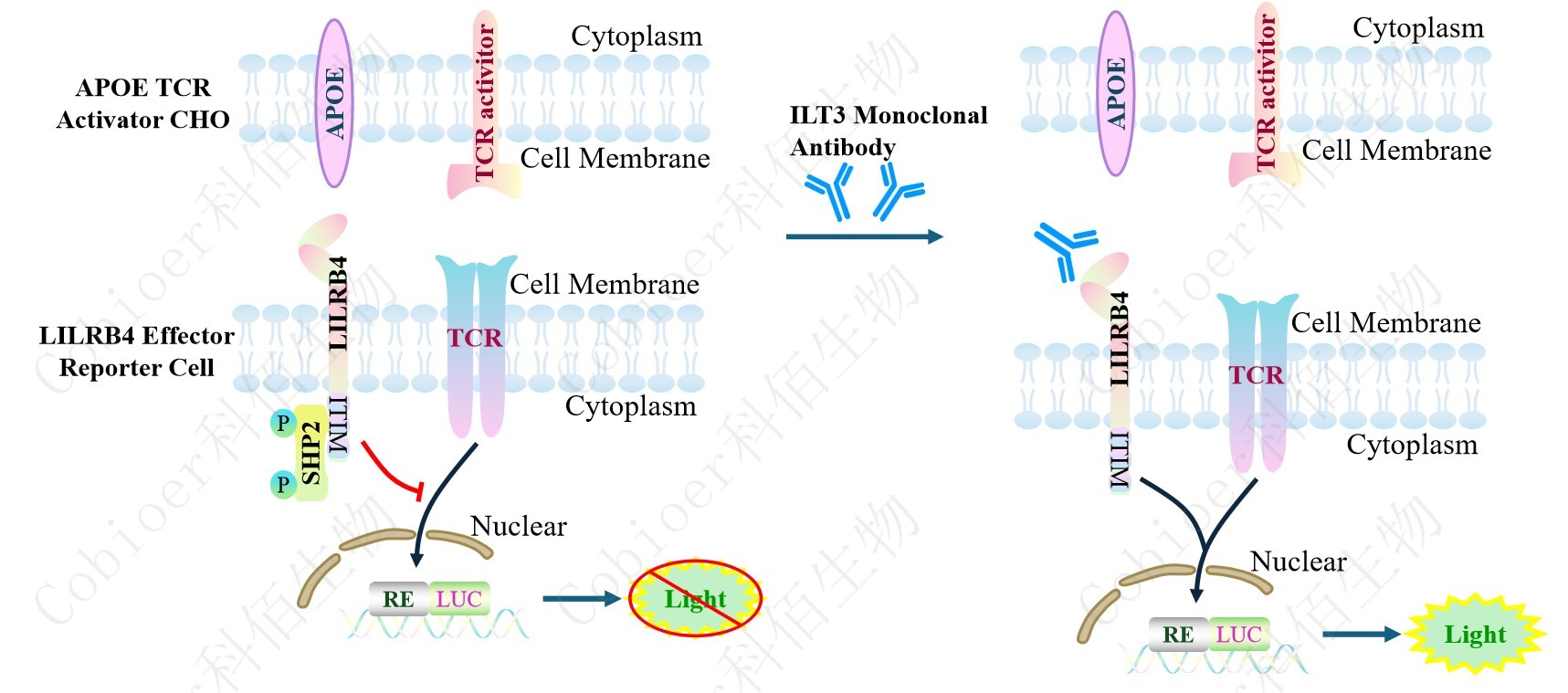 LILRB4 Effector Reporter Cell 報告基因藥靶模型很好的模擬了體內(nèi) LILRB4 的信號轉(zhuǎn) 導過程,原理見下圖所示。![]() ![]() Figure 1. LILRB4 Effector Reporter Cell 模型原理圖