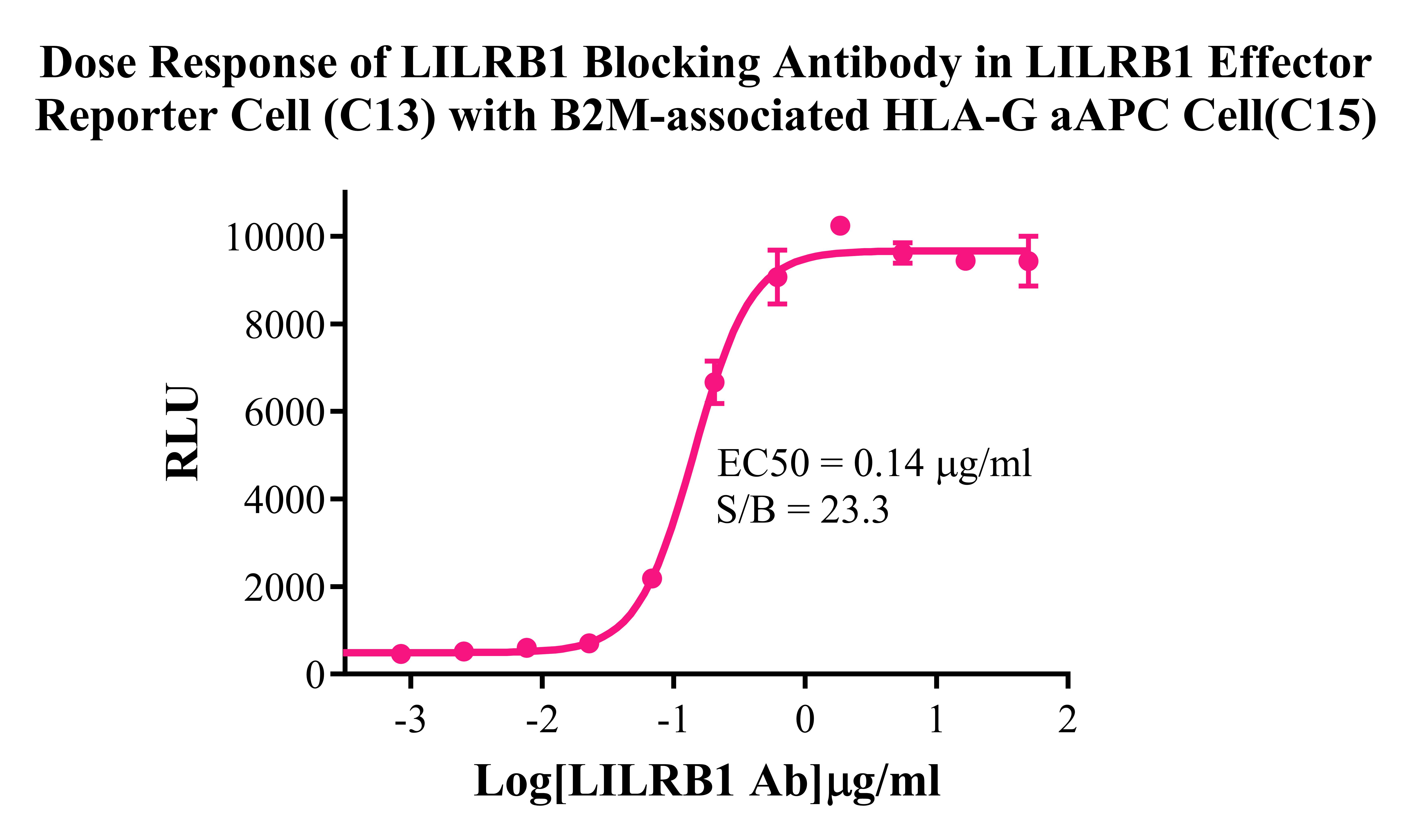 Figure 2.Dose Response of LILRB1 Blocking Antibody in LILRB1 Effector Reporter Cell (C13)With B2M-associated HLA-G/aAPC Cell (C15). |