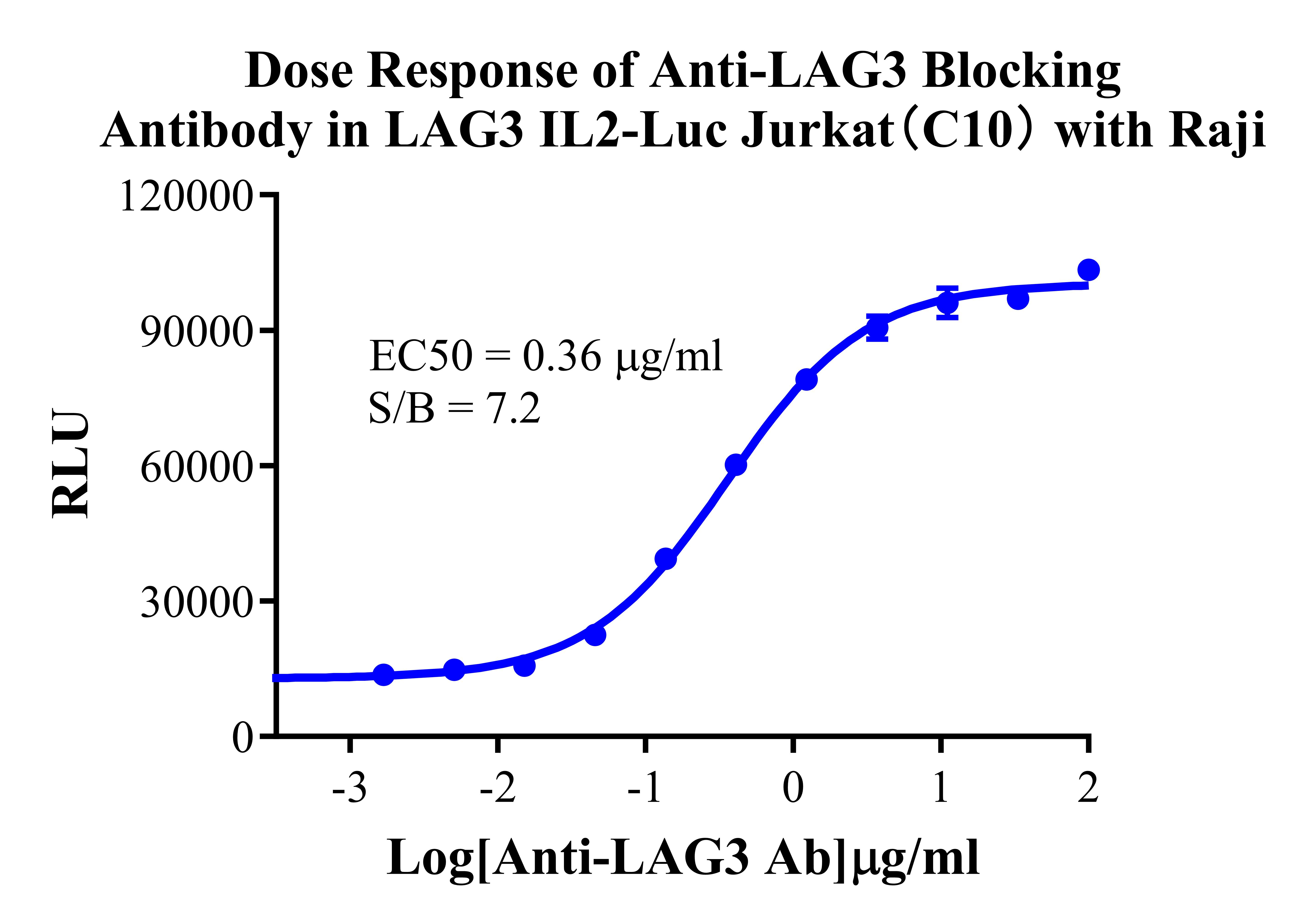 Figure 3. Detect Luciferase assay by Ultra Luciferase Detection Kit CBPH0001(we strongly suggest to purchase from Cobioer). Dose Response of Anti-LAG3 Blocking Antibody in LAG3 IL2-Luc Jurkat (C10) With Raji.