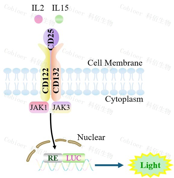 hIL2/IL15(hCD25 hCD122 hCD132)Effector Reporter Cell 報告基因藥靶模型很好的模擬了體內(nèi) IL2 受體三亞基的信號轉(zhuǎn)導過程,原理見下圖所示。