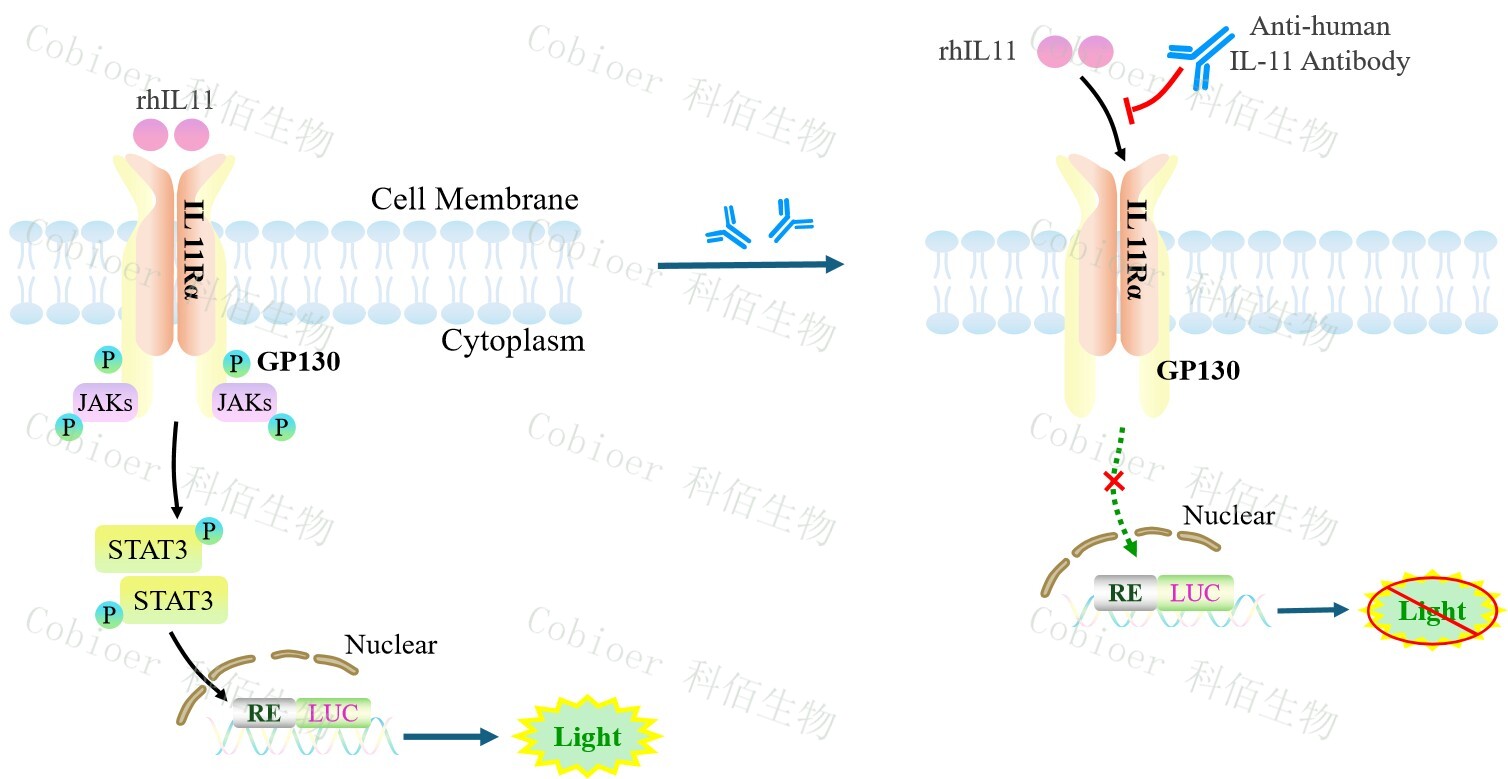 IL11 Effector Reporter Cell 報(bào)告基因藥靶模型很好的模擬了體內(nèi) IL11 的信號(hào)轉(zhuǎn)導(dǎo)過程, 原理見下圖所示。![]() Figure 1. IL11 Effector Reporter Cell 細(xì)胞模型原理圖 |