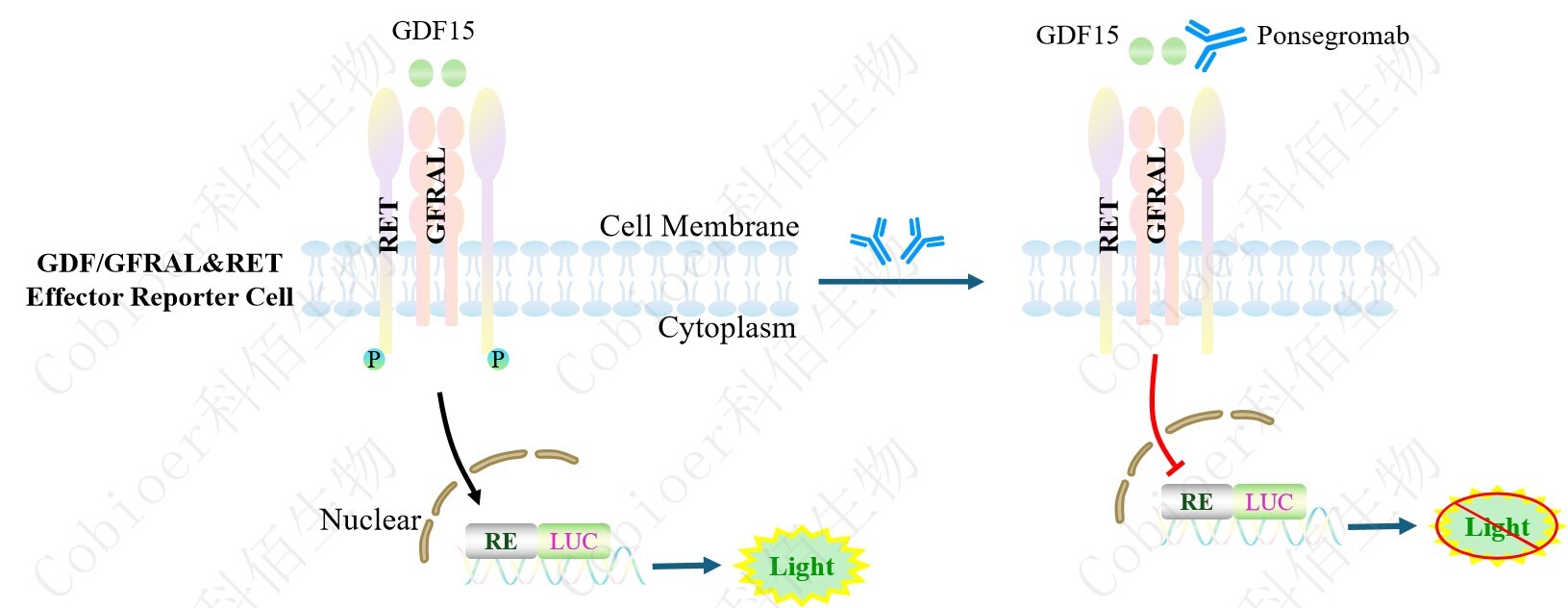 GDF/GFRAL&RET Effector Reporter Cell 報告基因藥靶模型很好的模擬了體內(nèi) GDF 的 信號轉(zhuǎn)導(dǎo)過程,原理見下圖所示。![]() Figure 1. GDF/GFRAL&RET Effector Reporter Cell 模型原理圖 |