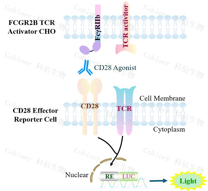 FCGR2B TCR Activator CHO,在基礎(chǔ)細胞上穩(wěn)定表達 FcγRIIb 和 aAPC。 FCGR2B TCR Activator CHO 作為 CD28 Effector Reporter Cell 的靶細胞進行功能檢測,其原理圖見下圖所示。![]() Figure 1. FCGR2B TCR Activator CHO 的原理圖 |
