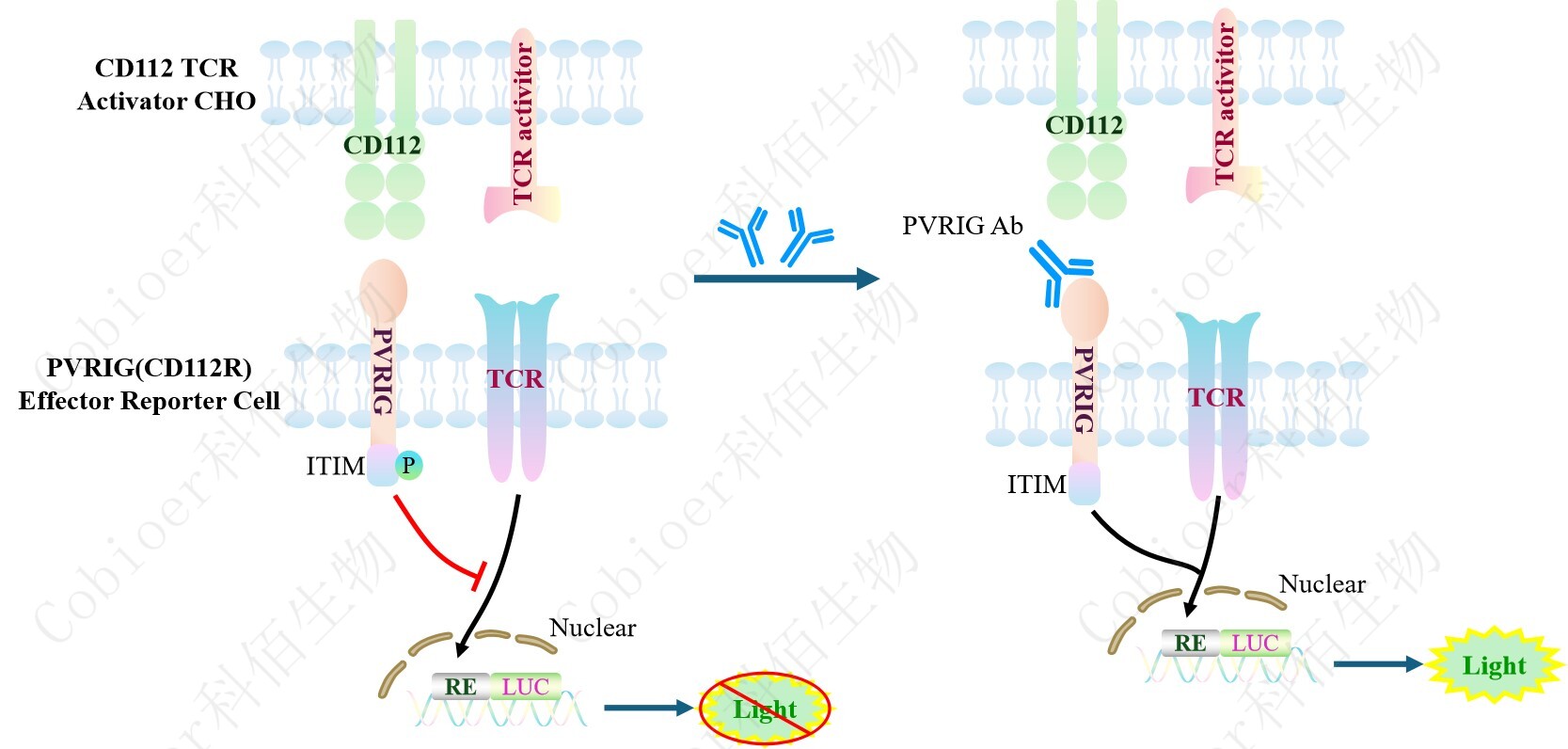 PVRIG(CD112R) Effector Reporter Cell 報告基因藥靶模型很好的模擬了體內(nèi) PVRIG 的 信號轉(zhuǎn)導過程,原理見下圖所示。