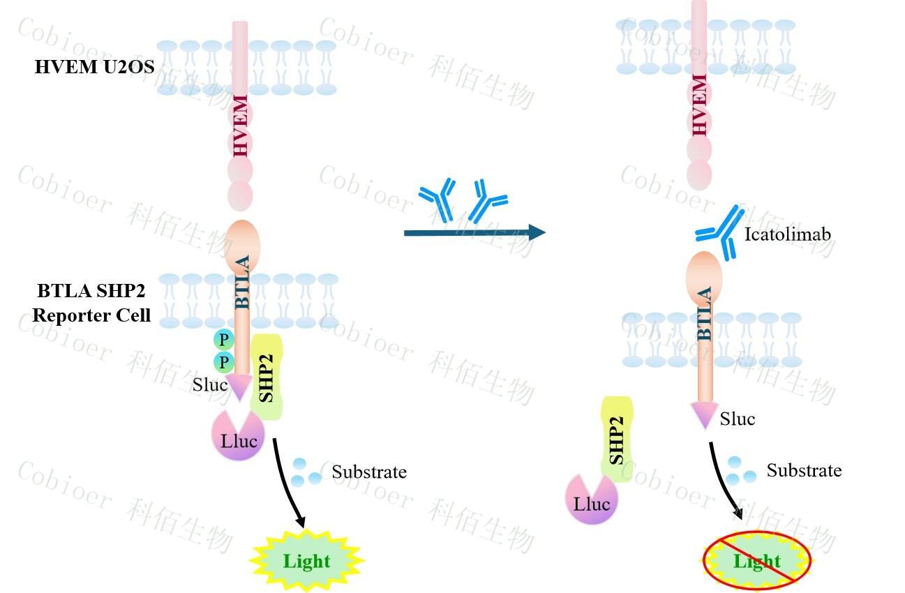 BTLA SHP2 Reporter Cell 報(bào)告基因藥靶模型很好的模擬了體內(nèi) BTLA/SHP2 的信號(hào)轉(zhuǎn)導(dǎo)過(guò)程,原理見(jiàn)下圖所示。![]() Figure 1. BTLA SHP2 Reporter Cell 細(xì)胞模型原理圖 |