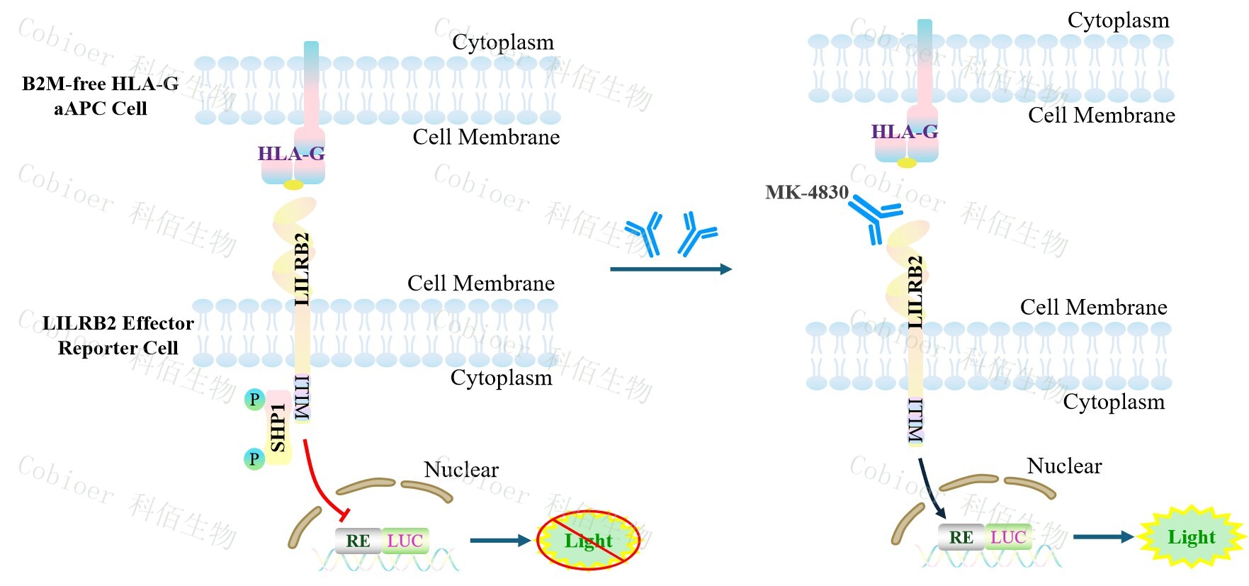 B2M-free HLA-G aAPC Cell 作為 LILRB2 Effector Reporter Cell 的靶細(xì)胞,很好的模擬 了體內(nèi) LILRB2 的信號(hào)轉(zhuǎn)導(dǎo)過(guò)程,原理見(jiàn)下圖所示。![]() Figure 1. B2M-free HLA-G aAPC Cell 模型原理圖 |
