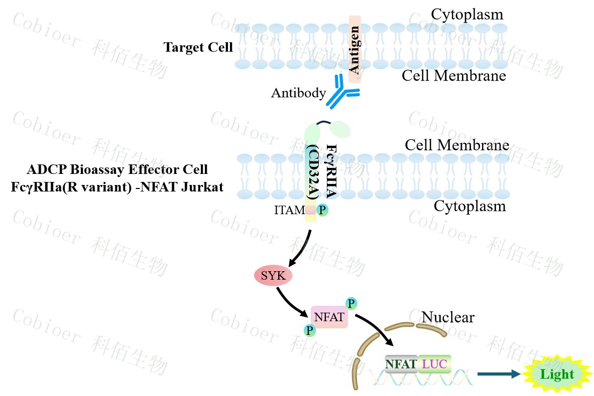 ADCP Bioassay Effector Cell FcγRIIa(R variant) -NFAT Jurkat 報告基因藥靶模型很好的 模擬了體內(nèi) ADCP 的信號轉(zhuǎn)導過程,原理見下圖所示。
