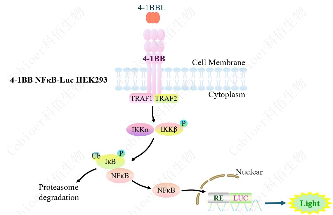 4-1BB NFκB-Luc HEK293 報(bào)告基因藥靶模型很好的模擬了體內(nèi) 4-1BB 的信號(hào)轉(zhuǎn)導(dǎo)過程, 原理見下圖所示。 Figure 1. 4-1BB NFκB-Luc HEK293 細(xì)胞模型原理圖
