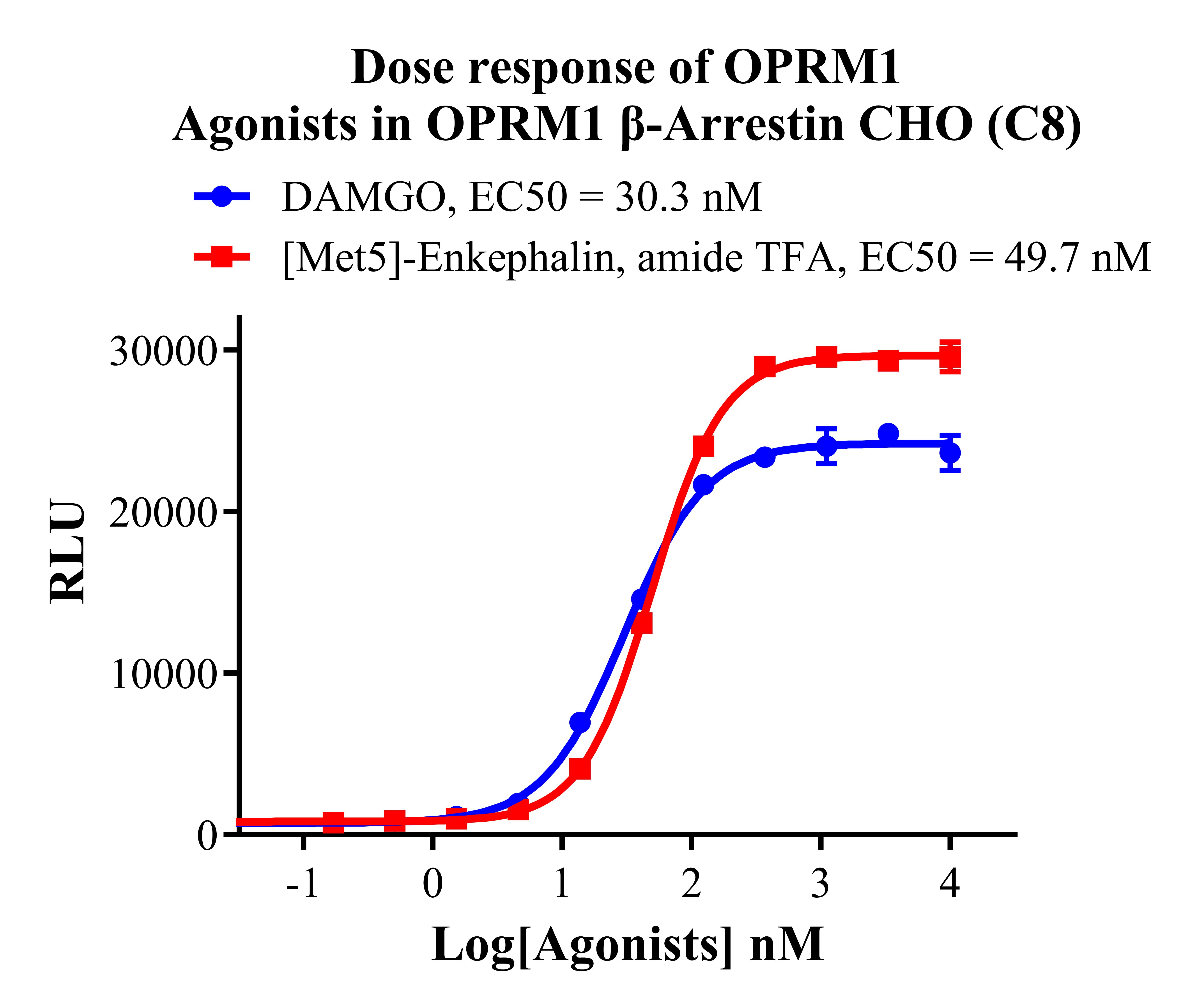 OPRM1 β-Arrestin CHO 報告基因藥靶模型很好的模擬了體內(nèi) OPRM1/β-Arrestin 的信號 轉(zhuǎn)導(dǎo)過程,原理見下圖所示。當(dāng)缺乏配體刺激時,β-Arrestin 不與 OPRM1 結(jié)合,融合β- Arrestin 的熒光素酶處于失活構(gòu)象,當(dāng) OPRM1 遭遇配體刺激時,融合熒光素酶報告基因的 β-Arrestin 被招募,使熒光素酶報告基因處于激活狀態(tài),加入其底物后發(fā)光信號增強(qiáng)。 |