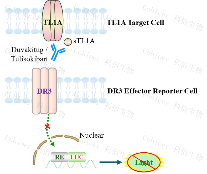 TL1A Target Cell 作為 DR3 Effector Reporter Cell 的靶細胞,很好的模擬了體內(nèi) DR3 的 信號轉(zhuǎn)導過程,原理見下圖所示。
