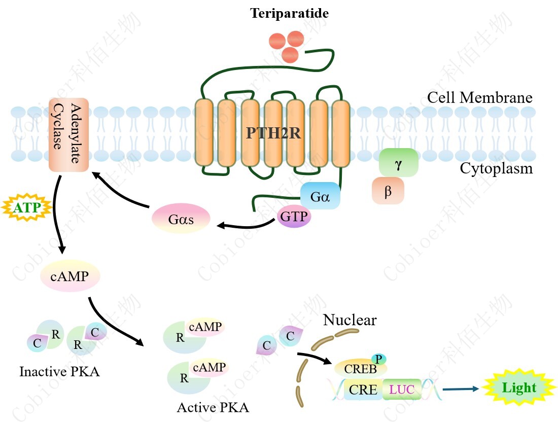 PTH2R CRE-Luc HEK293 報(bào)告基因藥靶模型很好的模擬了體內(nèi) PTH2R 的信號(hào)轉(zhuǎn)導(dǎo)過 程,原理見下圖所示。 ![]() Figure 1. PTH2R CRE-Luc HEK293 細(xì)胞模型原理圖 |
