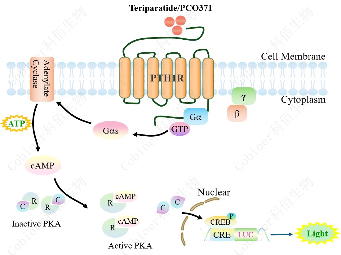 PTH1R CRE-Luc HEK293 報(bào)告基因藥靶模型很好的模擬了體內(nèi) PTH1R 的信號(hào)轉(zhuǎn)導(dǎo)過(guò)程,原理見(jiàn)下圖所示。 ![]() Figure 1. PTH1R CRE-Luc HEK293 細(xì)胞模型原理圖 |