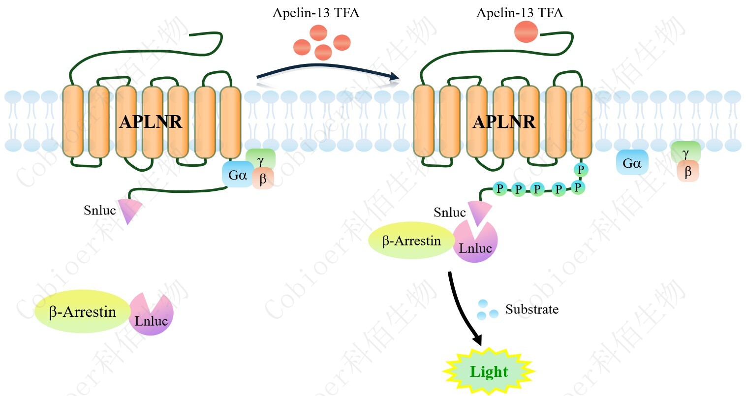 APLNR(APJ) β-Arrestin CHO 報(bào)告基因藥靶模型很好的模擬了體內(nèi) APLNR(APJ) /β-Arrestin 的信號(hào)轉(zhuǎn)導(dǎo)過(guò)程,原理見(jiàn)下圖所示。當(dāng)缺乏配體刺激時(shí),β-Arrestin 不與 APLNR (APJ)結(jié)合,融合β-Arrestin 的熒光素酶處于失活構(gòu)象,當(dāng) APLNR(APJ)遭遇配體刺激 時(shí),融合熒光素酶報(bào)告基因的β-Arrestin 被招募,使熒光素酶報(bào)告基因處于激活狀態(tài),加入 其底物后發(fā)光信號(hào)增強(qiáng)。![]() Figure 1. APLNR(APJ) β-Arrestin CHO 細(xì)胞模型原理圖 |