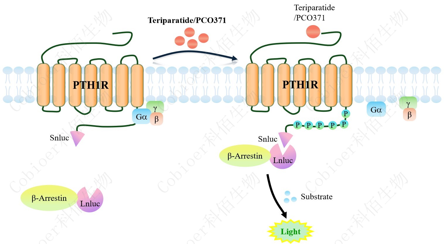 PTH1R β-Arrestin CHO PTH1R β-Arrestin CHO 報告基因藥靶模型很好的模擬了體內(nèi) PTH1R/β-Arrestin 的信號 轉(zhuǎn)導(dǎo)過程,原理見下圖所示。當缺乏配體刺激時,β-Arrestin 不與 PTH1R 結(jié)合,融合β- Arrestin 的熒光素酶處于失活構(gòu)象,當 PTH1R 遭遇配體刺激時,融合熒光素酶報告基因的 β-Arrestin 被招募,使熒光素酶報告基因處于激活狀態(tài),加入其底物后發(fā)光信號增強。 ![]() Figure 1. PTH1R β-Arrestin CHO 細胞模型原理圖 |