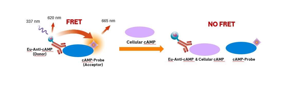 Cellular cyclic AMP Detection KIT是一種競爭性的檢測技術(shù),檢測細(xì)胞內(nèi)cAMP的量。藥物同貼壁細(xì)胞或者懸浮細(xì)胞共處理后,能通過此KIT檢測出藥物對細(xì)胞的作用。 檢測原理采用TR-FRET檢測技術(shù)。細(xì)胞內(nèi)天然的cAMP同cAMP-Probe競爭性結(jié)合Eu -Anti-cAMP。最終檢測出來的信號與樣本中cAMP的濃度成反比。