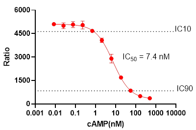 測試標(biāo)準(zhǔn)品的反應(yīng)曲線,以確定實(shí)驗室中Stimulation Buffer或者細(xì)胞培養(yǎng)基的檢測線性動態(tài)范圍。這還將驗證實(shí)驗中是否產(chǎn)生了預(yù)期的 S/B 和 cAMP的IC50值。 特別是IC10 和 IC90的數(shù)值將在實(shí)驗中非常有用,可以用于優(yōu)化細(xì)胞系的細(xì)胞密度。