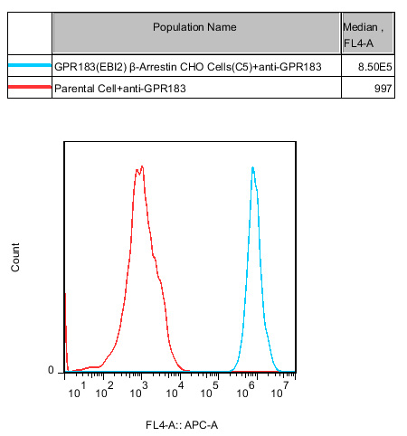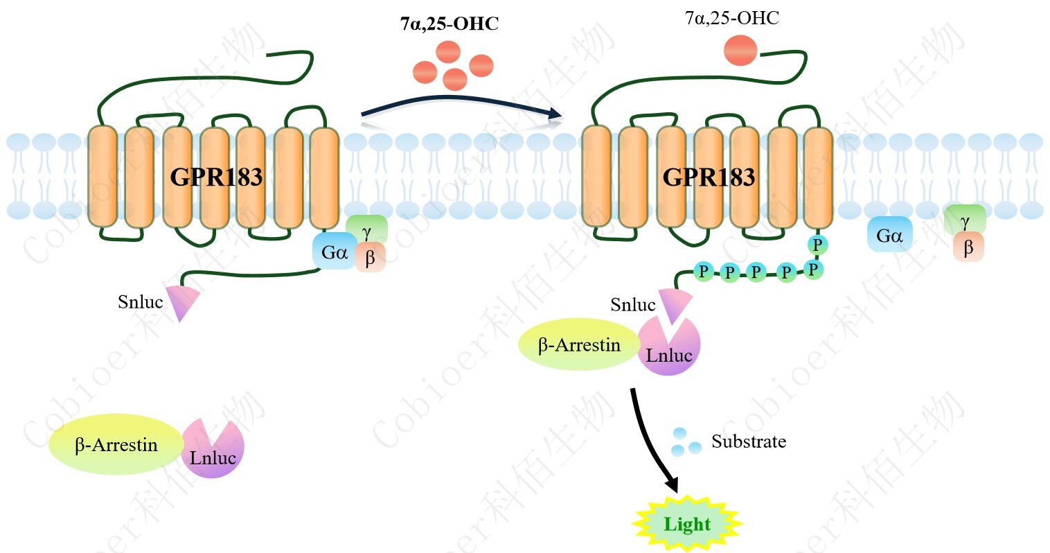 GPR183(EBI2) β-Arrestin CHO 報(bào)告基因藥靶模型很好的模擬了體內(nèi) GPR183(EBI2)/β- Arrestin 的信號轉(zhuǎn)導(dǎo)過程,原理見下圖所示。當(dāng)缺乏配體刺激時(shí),β-Arrestin不與 GPR183(EBI2) 結(jié)合,融合β-Arrestin 的熒光素酶處于失活構(gòu)象,當(dāng)GPR183(EBI2)遭遇配體 刺激時(shí),融合熒光素酶報(bào)告基因的β-Arrestin 被招募,使熒光素酶報(bào)告基因處于激活狀態(tài), 加入其底物后發(fā)光信號增強(qiáng)。