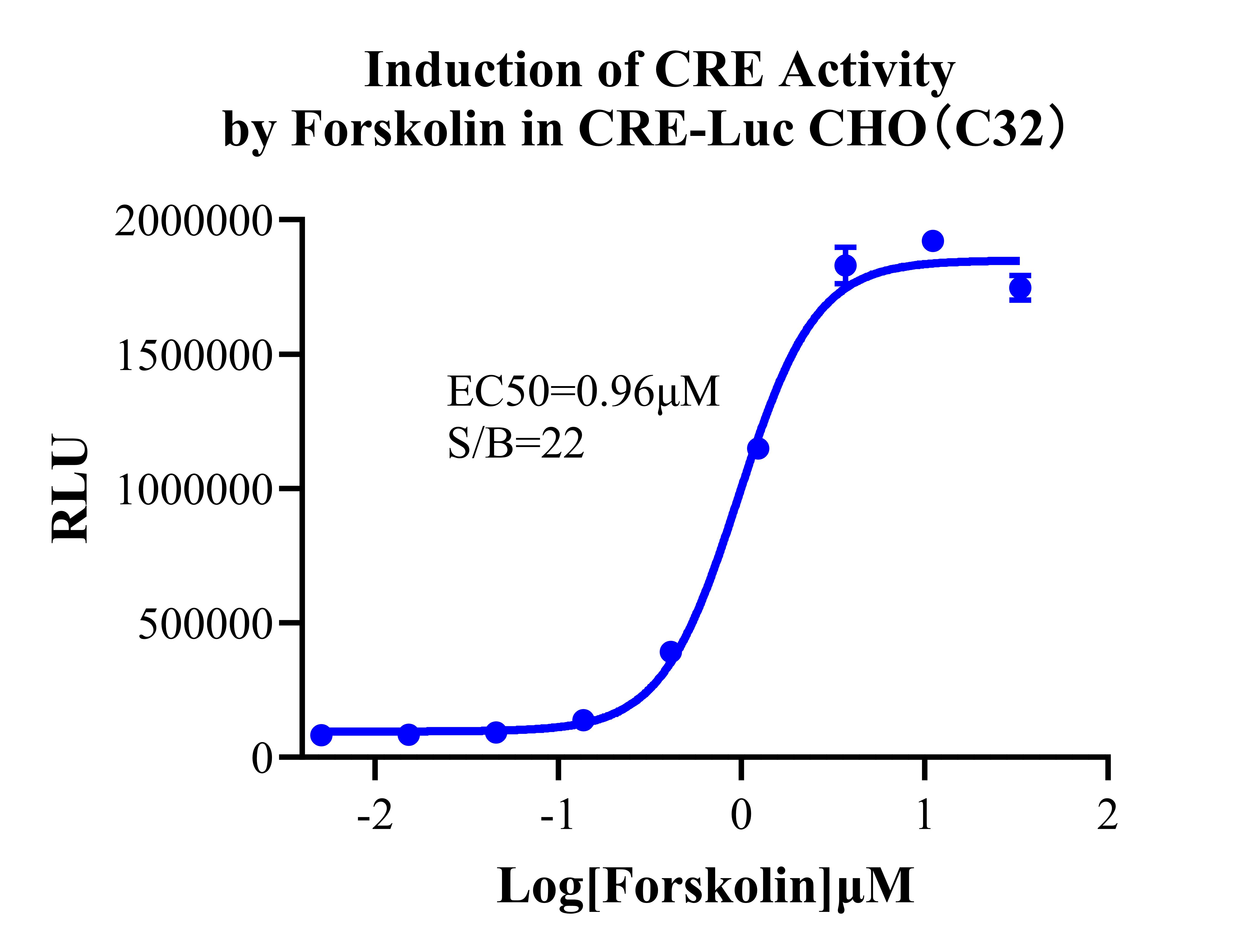 CRE-Luc CHO 報告基因細胞,是由 CRE 調(diào)控并表達 Luc 熒光素酶報告 基因的 CHO 細胞。Forskolin 是天然存在的直接腺苷酸環(huán)化酶(AC)/cAMP/CREB 的激活 劑,原理見下圖所示。