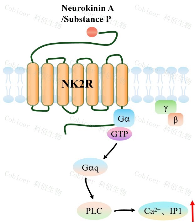 | 速激肽(Tachykinins )是分布在哺乳動(dòng)物中樞和周?chē)窠?jīng)系統(tǒng)中的一類(lèi)神經(jīng)肽。速激 肽物質(zhì) P(SP)、神經(jīng)激肽 A(NKA)和神經(jīng)激肽 B(NKB)共享一個(gè)保守的 C 端基序, 對(duì)速激肽受體(NK1R、NK2R 和 NK3R)的激活至關(guān)重要。NKA 優(yōu)先激活與 Gα偶聯(lián)的 NK2R,而 SP 和 NKB 分別優(yōu)先結(jié)合 NK1R 和 NK3R。三種速激肽都能夠在所有速激肽受 體類(lèi)型中表現(xiàn)為完全激動(dòng)劑。 NK2R 是一種 GPCR,普遍存在于中樞和周?chē)窠?jīng)系統(tǒng),然而,有研究發(fā)現(xiàn),NK2R 與 血紅蛋白 A1c(HbA1c)水平顯著相關(guān)。HbA1c 是評(píng)估長(zhǎng)期血糖控制的重要指標(biāo),表明 NK2R 可能在糖代謝調(diào)控中發(fā)揮關(guān)鍵作用。 | |