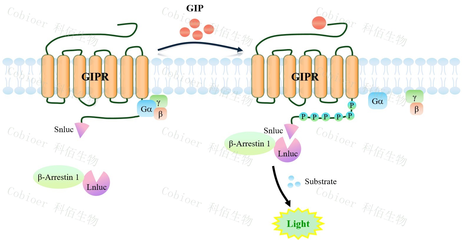 GIPR β-Arrestin 1 CHO 報告基因藥靶模型很好的模擬了體內(nèi) GIPR/β-Arrestin 1 的信號 轉(zhuǎn)導(dǎo)過程,原理見下圖所示。當(dāng)缺乏配體刺激時,β-Arrestin 1 不與 GIPR 結(jié)合,融合β- Arrestin 1 的熒光素酶處于失活構(gòu)象,當(dāng) GIPR 遭遇配體刺激時,融合熒光素酶報告基因的 β-Arrestin 1 被招募,使熒光素酶報告基因處于激活狀態(tài),加入其底物后發(fā)光信號增強(qiáng)。![]() Figure 1. GIPR β-Arrestin 1 CHO 細(xì)胞模型原理圖 |