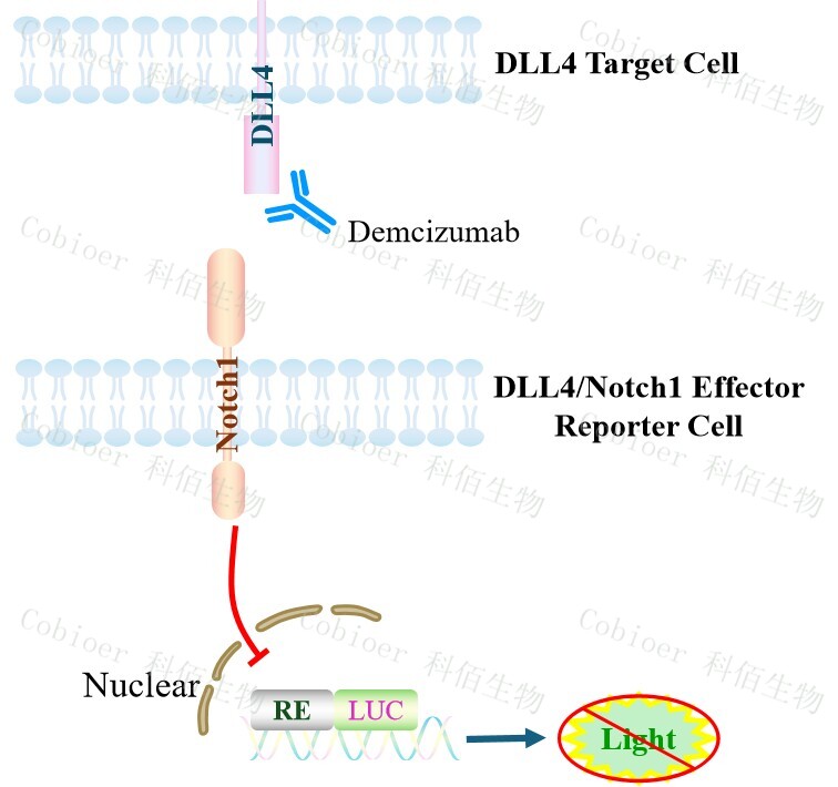 DLL4/Notch1 Effector Reporter Cell 報(bào)告基因藥靶模型很好的模擬了體內(nèi) DLL4/Notch1 的信號轉(zhuǎn)導(dǎo)過程,原理見下圖所示。