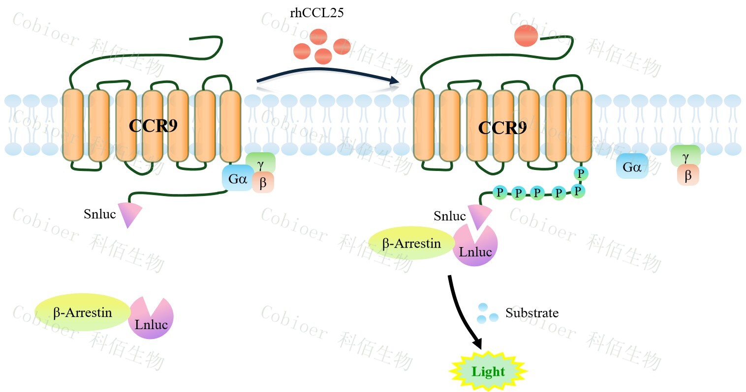 CCR9 β-Arrestin CHO 報(bào)告基因藥靶模型很好的模擬了體內(nèi) CCR9/β-Arrestin 的信號(hào)轉(zhuǎn)導(dǎo)過(guò)程,原理見(jiàn)下圖所示。當(dāng)缺乏配體刺激時(shí),β-Arrestin 不與 CCR9 結(jié)合,融合β-Arrestin 的熒光素酶處于失活構(gòu)象,當(dāng) CCR9 遭遇配體刺激時(shí),融合熒光素酶報(bào)告基因的β-Arrestin 被招募,使熒光素酶報(bào)告基因處于激活狀態(tài),加入其底物后發(fā)光信號(hào)增強(qiáng)。![]() Figure 1. CCR9 β-Arrestin CHO 細(xì)胞模型原理圖 |