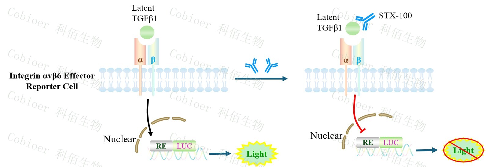 Integrin αvβ6 Effector Reporter Cell 報告基因藥靶模型很好的模擬了體內(nèi)αvβ6 的信號轉 導過程,原理見下圖所示。