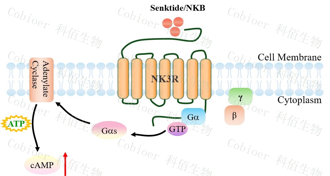 | 速激肽(Tachykinin)是在整個(gè)神經(jīng)和免疫系統(tǒng)中表達(dá)的神經(jīng)肽,作為興奮性神經(jīng)遞質(zhì), 它們?cè)谡{(diào)節(jié)各種生理功能中發(fā)揮重要的作用。在不同的速激肽中,P 物質(zhì)(SP)、神經(jīng)激 肽 A(NKA) 和 NKB 已得到充分研究。這些肽可以通過(guò)三種不同的 GPCR、神經(jīng)激肽 1 受體(NK1R)、神經(jīng)激肽 2 受體(NK2R) 和 NK3R 發(fā)揮作用。作為具有不同親和力的 完全激動(dòng)劑。 NK3R(Neurokinin 3 Receptor),又稱(chēng) TACR3,是速激肽受體家族的重要成員,屬于 GPCR 超家族。其內(nèi)源性配體為神經(jīng)激肽 B(Neurokinin B, NKB),通過(guò)激活下游信號(hào)通 路參與生殖調(diào)控、神經(jīng)內(nèi)分泌調(diào)節(jié)及多種疾病進(jìn)程。近年來(lái),NK3R 成為治療更年期癥狀、 神經(jīng)精神疾病及癌癥的熱門(mén)靶點(diǎn)。 |