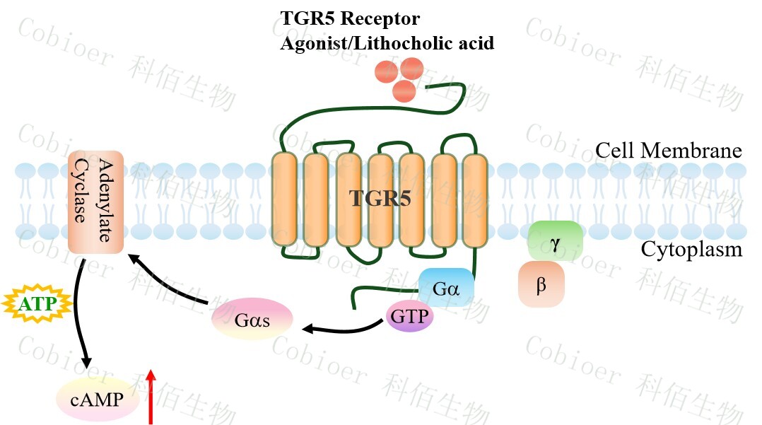 | TGR5 受體是第一個已知的膽汁酸特異性 G 蛋白偶聯(lián)受體,也被稱為膽汁酸受體 1(GPBAR1),屬于 A 類 GPCR 亞家族。該受體由七個跨膜螺旋(TMH1-7)、三個胞外環(huán) (ECL1-3)組成,有助于配體結(jié)合,以及三個胞內(nèi)環(huán)(ICL1-3),參與將信號傳遞給下游 信號分子。TGR5 在體內(nèi)廣泛存在,在膽囊、回腸、結(jié)腸、棕色脂肪組織、脾臟、肺、骨 骼肌、胰島,肝臟中均有表達(dá)。有文獻(xiàn)報道 TGR5 被認(rèn)為是治療代謝性疾?。ㄈ?2 型糖尿 病)的潛在靶點。此外,TGR5 還能降低單核細(xì)胞中促炎細(xì)胞因子的水平,在炎癥過程 (包括結(jié)腸炎和動脈粥樣硬化)中發(fā)揮核心作用的病理調(diào)節(jié)。 | |