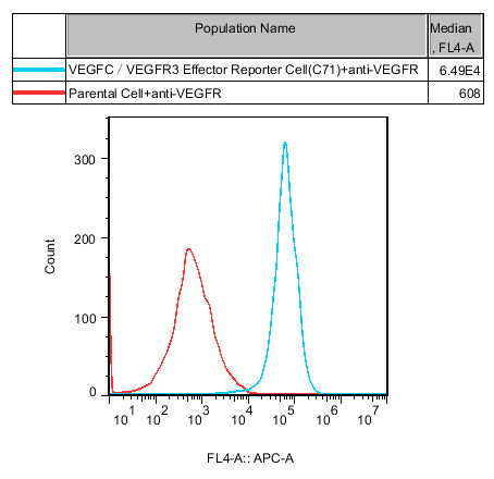 VEGFC/VEGFR3 Effector Reporter Cell 報(bào)告基因藥靶模型很好的模擬了體內(nèi) VEGFC/VEGFR3 的信號轉(zhuǎn)導(dǎo)過程,原理見下圖所示。![]() Figure 1. VEGFC/VEGFR3 Effector Reporter Cell 細(xì)胞模型原理圖 |