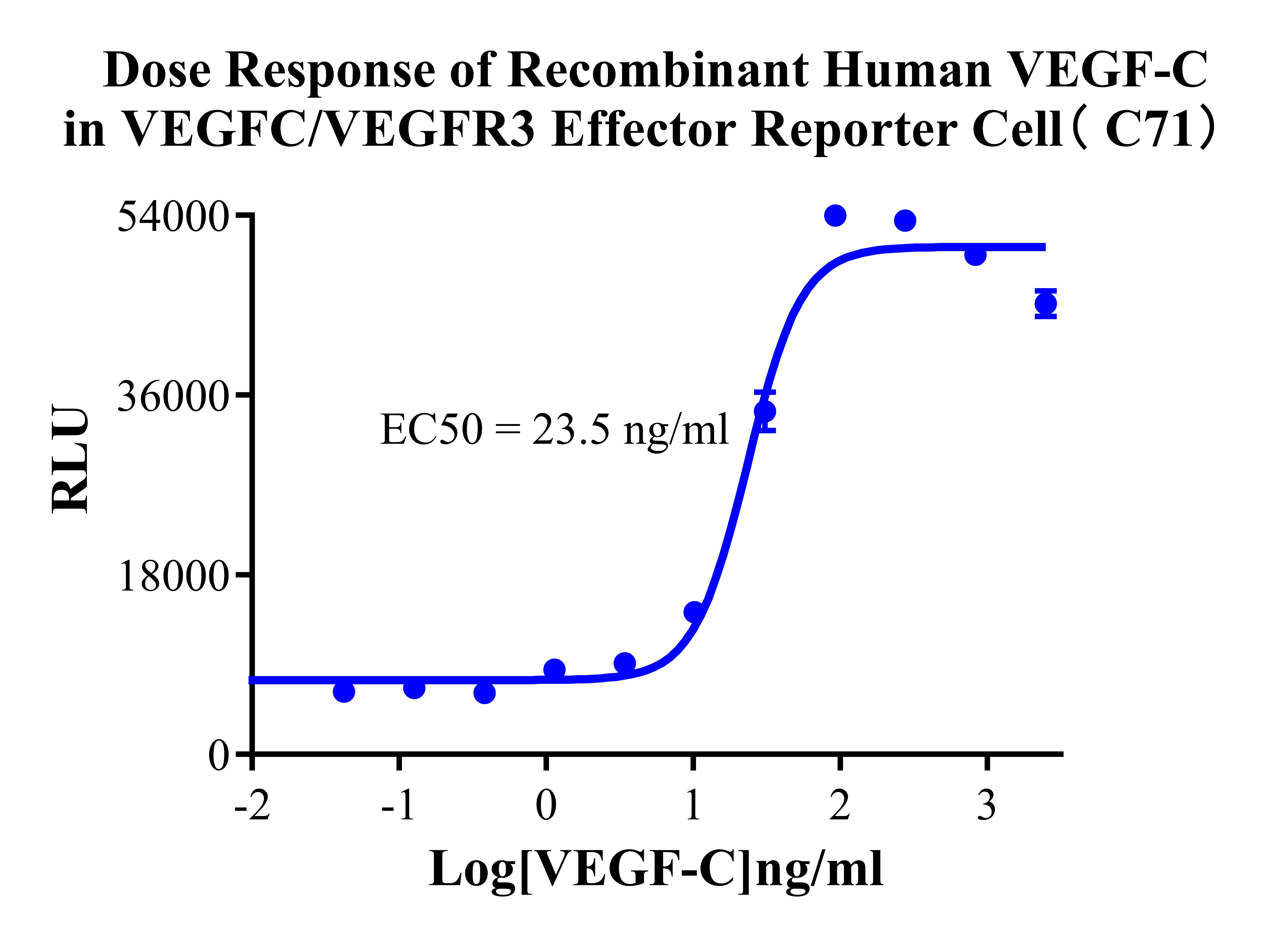 | VEGF 又稱血管通透性因子(VPF),是一種二聚體糖蛋白,與細(xì)胞表面的 VEGF 受 體(VEGFR)結(jié)合,從而激活細(xì)胞內(nèi)酪氨酸激酶,啟動一系列參與血管生成和血管生成的 信號級聯(lián)反應(yīng)事件。在哺乳動物中,VEGF 家族有 5 個(gè)成員:VEGFA、VEGFB、VEGFC、 VEGFD 和胎盤生長因子(PGF)。VEGFC 是分泌型二聚體糖蛋白(全長 58 kDa),需經(jīng) 蛋白酶(如 ADAMTS3)切割激活為 21 kDa 成熟肽以增強(qiáng)其生物活性,其核心功能是主導(dǎo) 淋巴管生成,在發(fā)育期廣泛表達(dá)于心、腎、腦間充質(zhì),成年后主要富集于淋巴管內(nèi)皮周細(xì) 胞、巨噬細(xì)胞及腫瘤微環(huán)境,通過驅(qū)動胚胎淋巴系統(tǒng)發(fā)育和成體淋巴重塑發(fā)揮關(guān)鍵作用。 VEGF 家族成員以重疊的方式結(jié)合三種受體酪氨酸激酶(VEGFR1、VEGFR2 和 VEGFR3)。這些受體都屬于跨膜酪氨酸激酶受體,包括三個(gè)主要區(qū)域,即細(xì)胞外區(qū)域、 跨膜區(qū)域和細(xì)胞內(nèi)羧基端。當(dāng) VEGF 與其受體結(jié)合時(shí),形成同源二聚體復(fù)合物,使其蛋白 構(gòu)象發(fā)生改變,酪氨酸殘基發(fā)生自磷酸化并將信號傳導(dǎo)到下游。 |