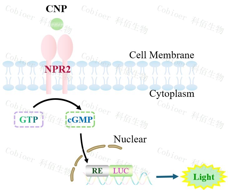 NPR2 Effector Reporter Cell 報(bào)告基因藥靶模型很好的模擬了體內(nèi) NPR2 的信號(hào)轉(zhuǎn)導(dǎo)過(guò)程,原理見下圖所示。![]() Figure 1. NPR2 Effector Reporter Cell 細(xì)胞模型原理圖