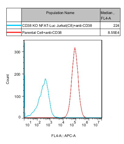 ![]() Figure 2.CD38 KO NFAT-Luc Jurkat Cell 在 Jurkat 細胞上敲除 CD38。 |