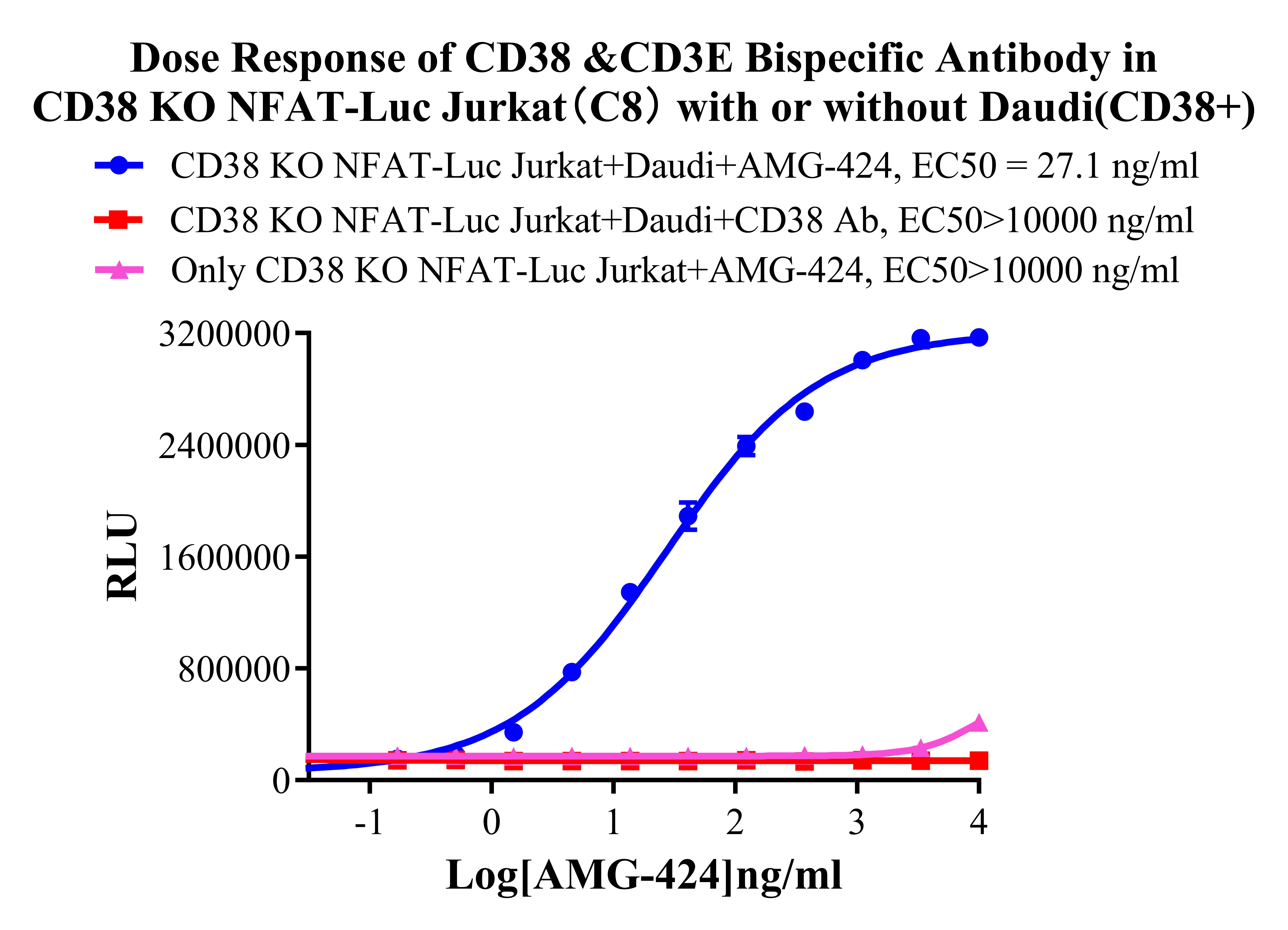 CD38 KO NFAT-Luc Jurkat Cell 報告基因藥靶模型通過報告基因的信號反映 T 細胞受體 (TCR)信號通路的激活水平,原理見下圖所示。![]() Figure 1. CD38 KO NFAT-Luc Jurkat Cell 細胞模型圖 |