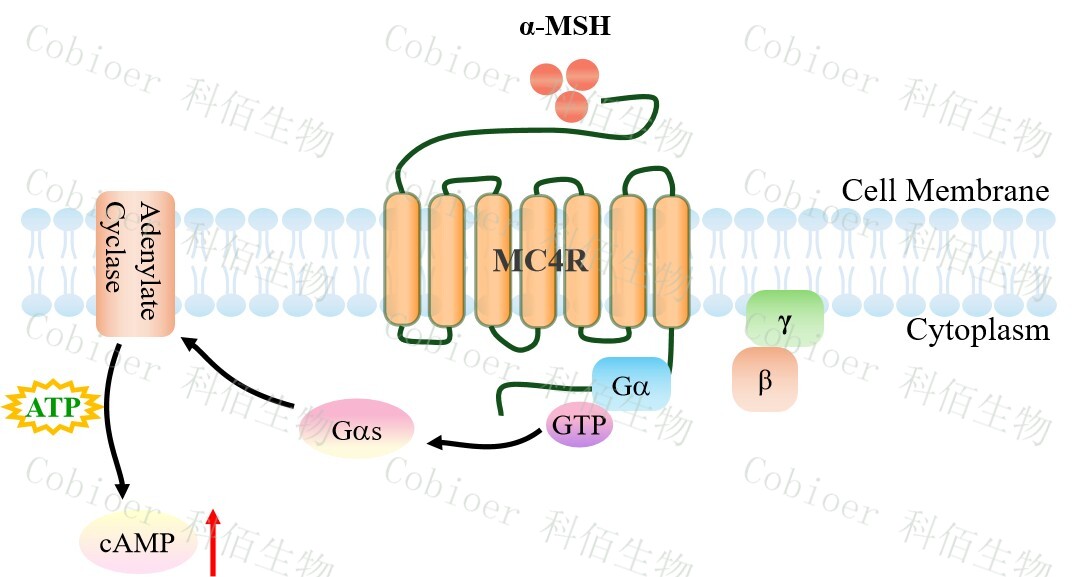 黑皮質(zhì)素 4 受體(MC4R)是黑皮質(zhì)素受體家族成員之一,其家族成員還包括:MC1R、 MC2R、MC3R 和 MC5R。該家族也是 GPCR 超家族中具有重大治療前景的一個亞家族, 屬于視紫紅質(zhì)樣 A 類 GPCR。MC4R 主要分布于下丘腦室旁核、杏仁核等食欲與能量平衡 調(diào)控中樞,其內(nèi)源性激動配體為α-黑素細胞刺激素(α-MSH),拮抗配體為刺豚鼠相關(guān)蛋 白(AgRP);該受體通過偶聯(lián) Gs 蛋白激活腺苷酸環(huán)化酶,引起 cAMP 升高,從而啟動 PKA/CREB 信號通路,并介導(dǎo)β-arrestin 依賴的 MAPK 活化,核心功能為抑制食欲、促進能 量消耗,其功能喪失性突變直接導(dǎo)致單基因肥胖、胰島素抵抗及代謝綜合征,而功能獲得 性突變則與反常的瘦表型相關(guān)。