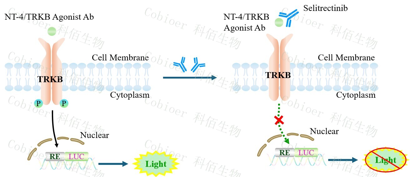 TRKB Effector Reporter Cell 報告基因藥靶模型很好的模擬了體內(nèi) TRKB 的信號轉(zhuǎn)導(dǎo)過程,原理見下圖所示。![]() Figure 1. TRKB Effector Reporter Cell 模型原理圖 |