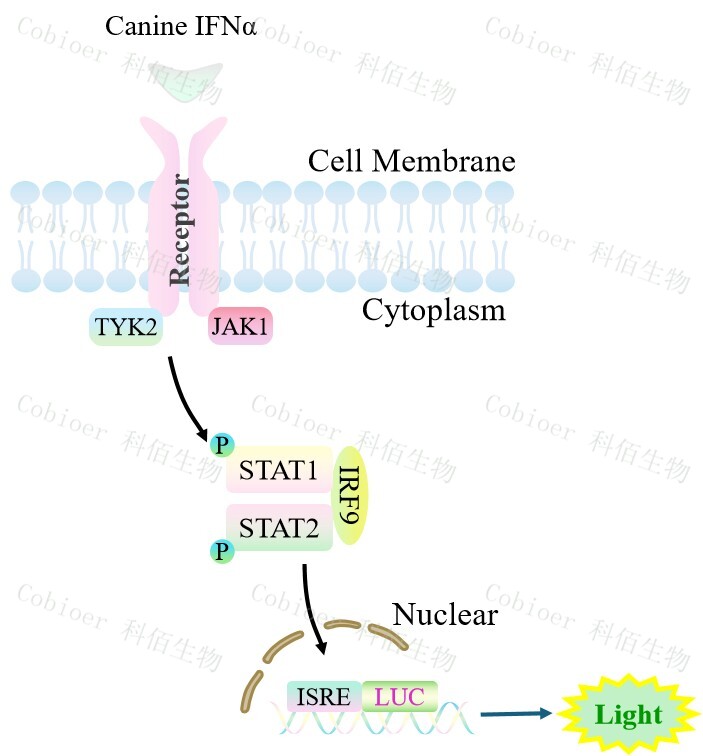 Canine IFNα&β Effector Reporter Cell 報告基因細胞,是由調(diào)控因子調(diào)控 并表達 Luc 熒光素酶報告基因的重組細胞。IFNα與受體結(jié)合,激活 ISRE 的原理見下圖所示。![]() Figure 1. Canine IFNα&β Effector Reporter Cell 細胞模型原理圖 |