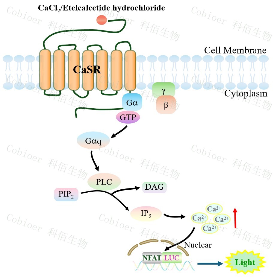 CaSR NFAT-Luc HEK293 細(xì)胞藥靶模型很好的模擬了體內(nèi) CaSR 的信號轉(zhuǎn)導(dǎo)過程,原 理見下圖所示。![]() Figure 1. CaSR NFAT-Luc HEK293 細(xì)胞模型原理圖 |