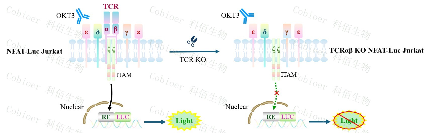 TCRαβ KO NFAT-Luc Jurkat 報(bào)告基因藥靶模型很好的模擬了體內(nèi) TCR 的信號(hào)轉(zhuǎn)導(dǎo)過(guò)程, 原理見(jiàn)下圖所示。![]() Figure 1. TCRαβ KO NFAT-Luc Jurkat 細(xì)胞模型原理圖 |