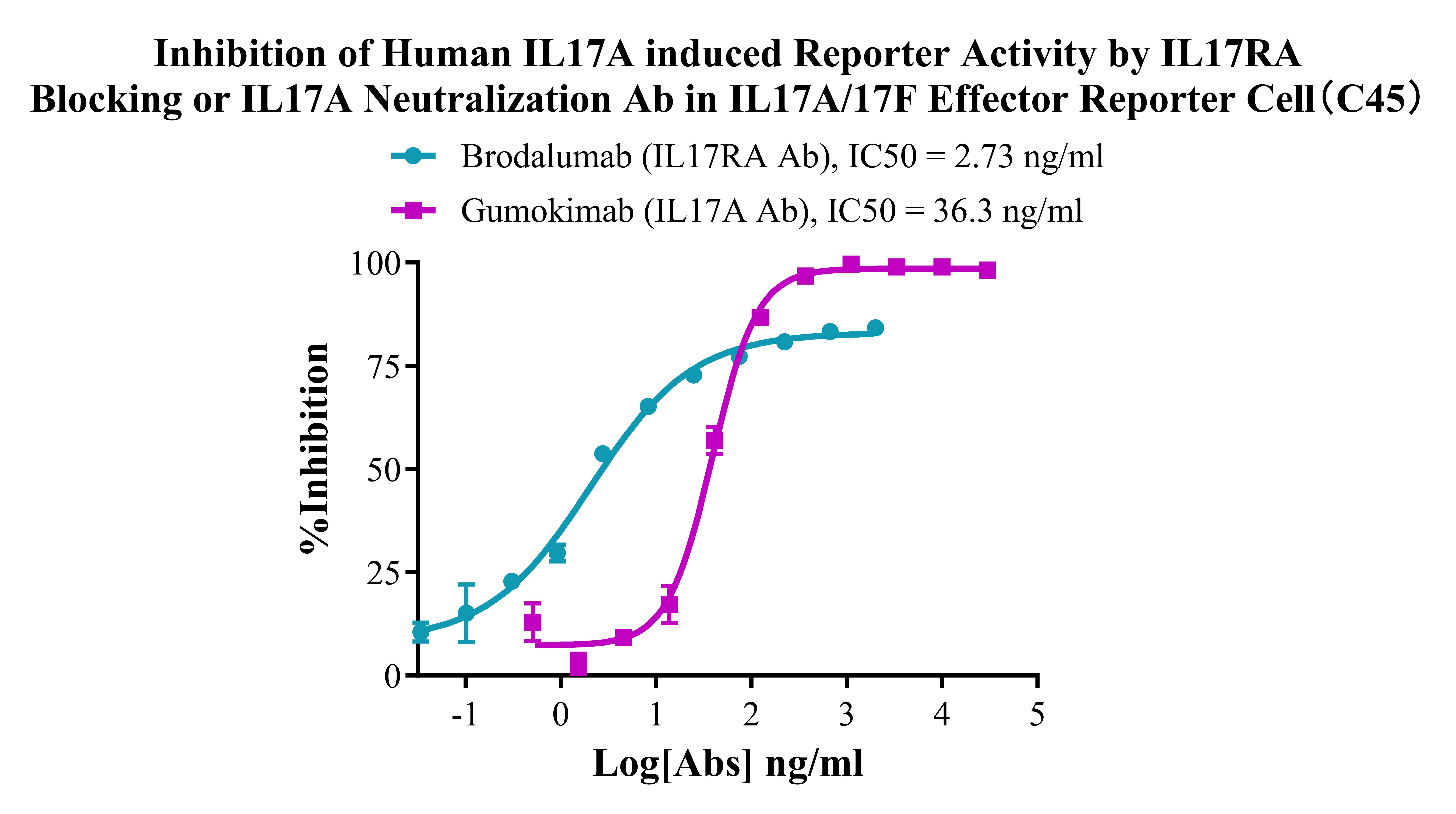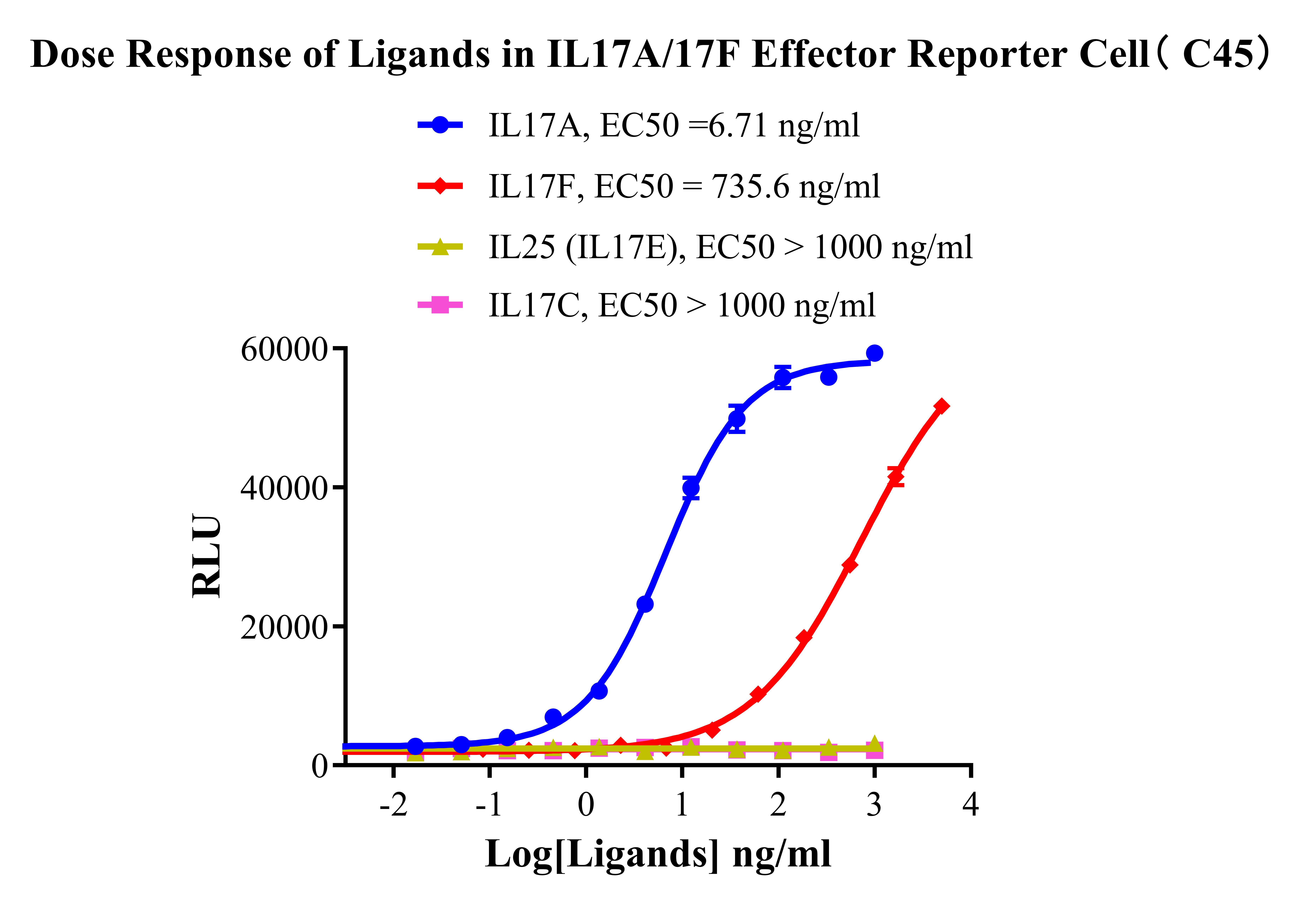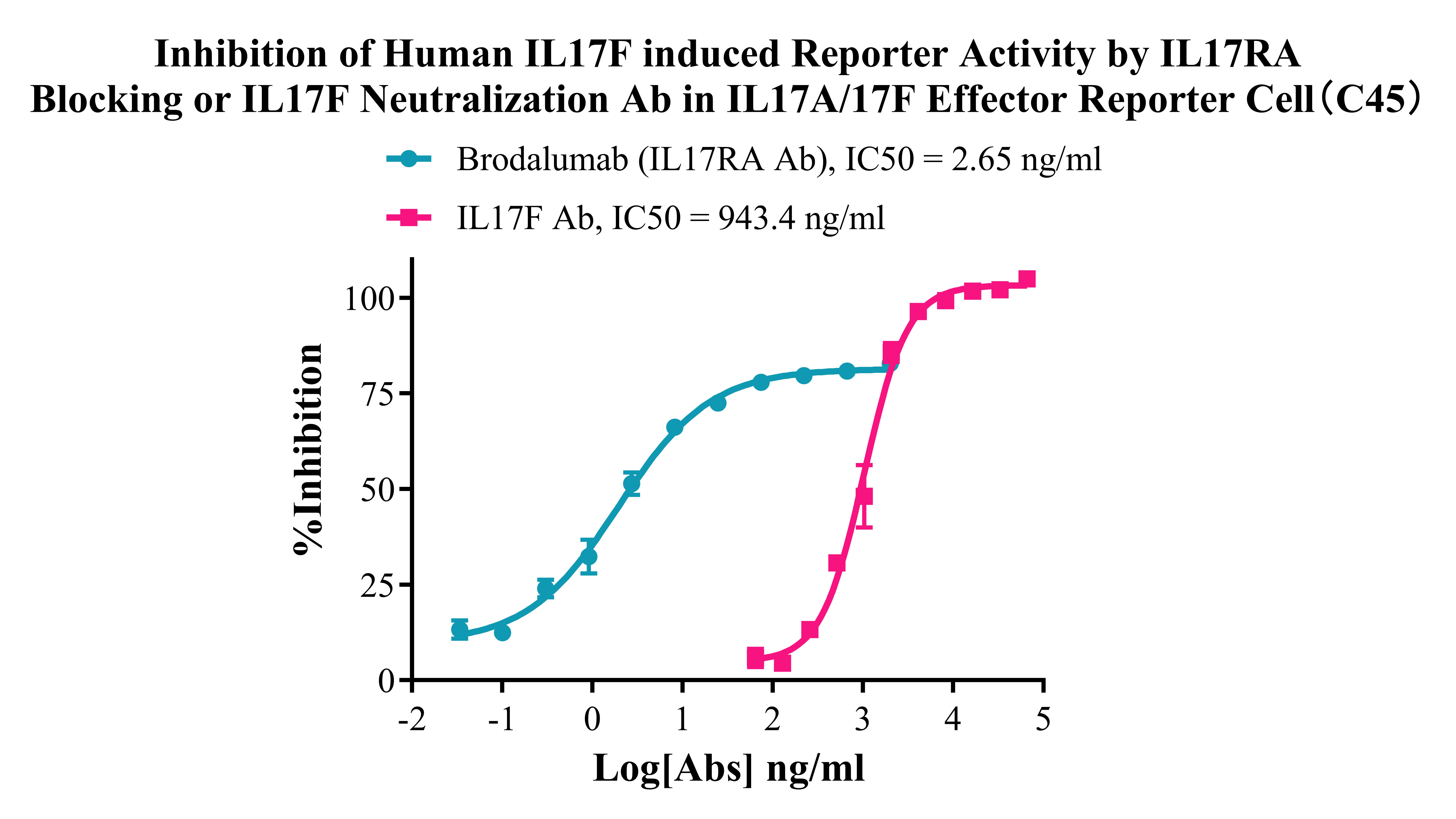 ![]() Figure 2. Recombinant IL17A/17F Effector Reporter Cell stably expressing IL17RA&IL17RC. ![]() Figure 3.Dose Response of Ligands in IL17A/17F Effector Reporter Cell (C45). ![]() Figure 4. Inhibition of Human IL17A induced Reporter Activity by IL17RA Blocking or IL17A Neutralization Ab in IL17A/17F Effector Reporter Cell(C45). ![]() Figure 4.Inhibition of Human IL17F induced Reporter Activity by IL17RA Blocking or IL17F Neutralization Ab in IL17A/17F Effector Reporter Cell (C45). |